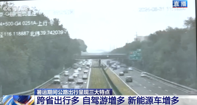 首先是跨省出行占比增多。7月1日至8月29日,根据交通运输部路网中心的统计,全国高速公路网日均流量约3602万辆,超六成以上的车流都是跨省。第二个特点是小客车自驾游增多,公路出行中,小客车自驾出行的占比将近八成,较去年略有上升。第三个特点就是新能源车辆的增加,全国驾车热门目的地城市有北京市、杭州市、成都市、重庆市、上海市、广州市等。