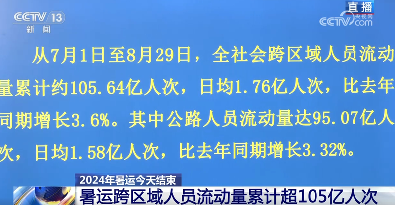 央视网消息:从7月1日到8月31日,为期62天的暑运31日结束。交通运输部发布数据,暑运期间全社会跨区域人员流动量日均达1.76亿人次。今年暑运全国公路和水路出行有什么特点?我们马上来连线正在交通运输部综合调度指挥中心的总台央视记者唐颖。