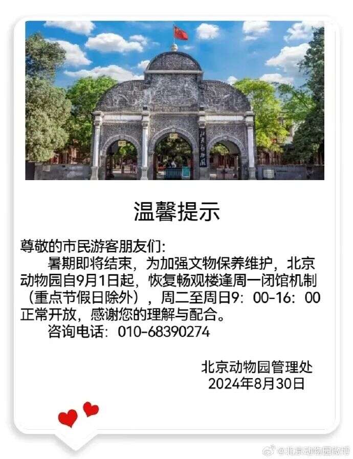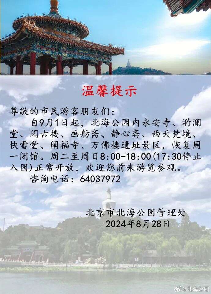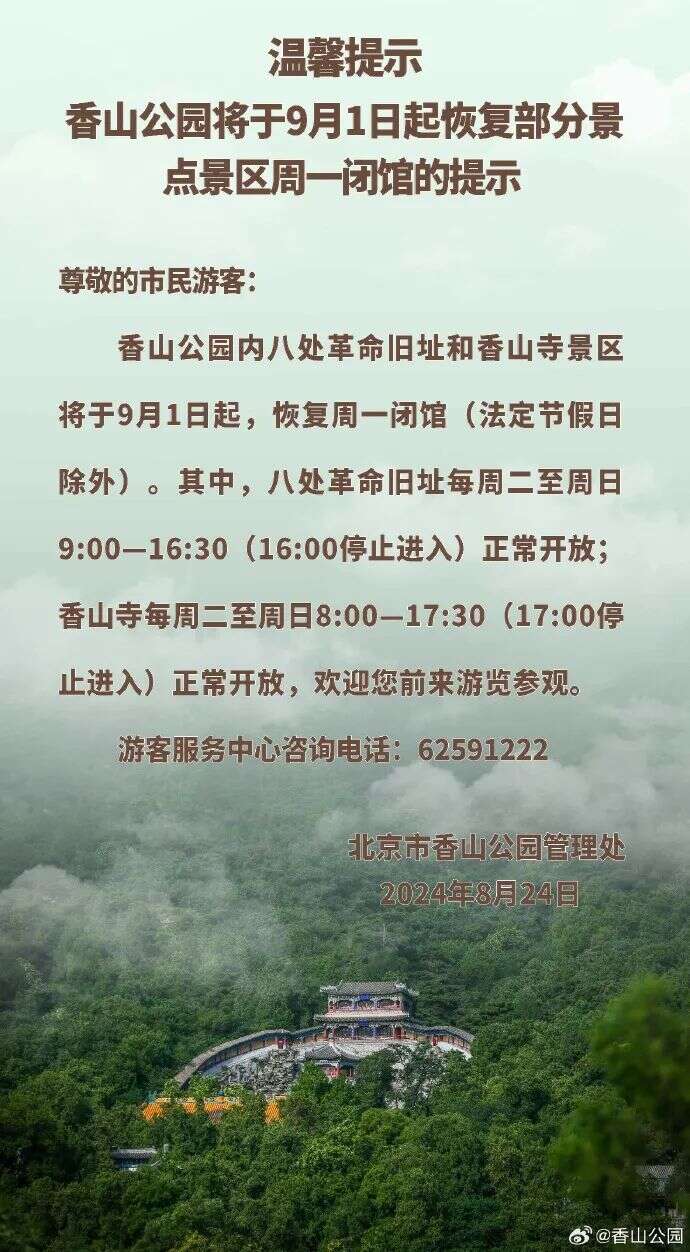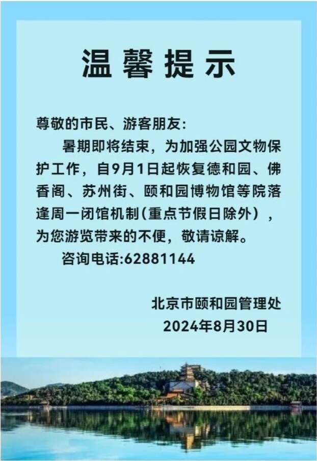 暑期即将结束,客流量回落,为加强文物保护与植物养护,自2024年9月1日起,国家植物园(北园)科普馆、曹雪芹纪念馆、卧佛寺、盆景园恢复周一闭馆机制(法定节假日除外)。