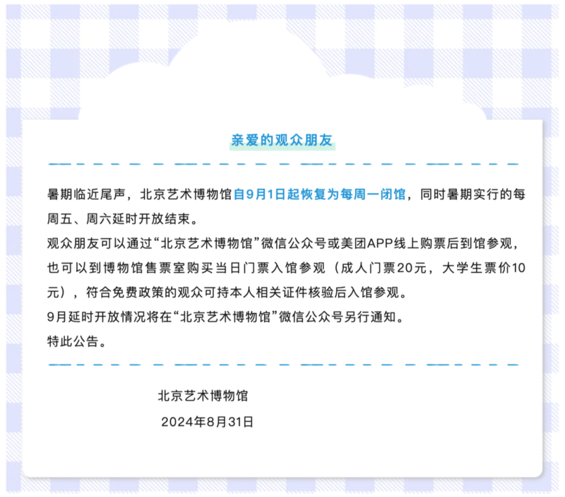 北京艺术博物馆自9月1日起恢复为每周一闭馆,同时暑期实行的每周五、周六延时开放结束。
