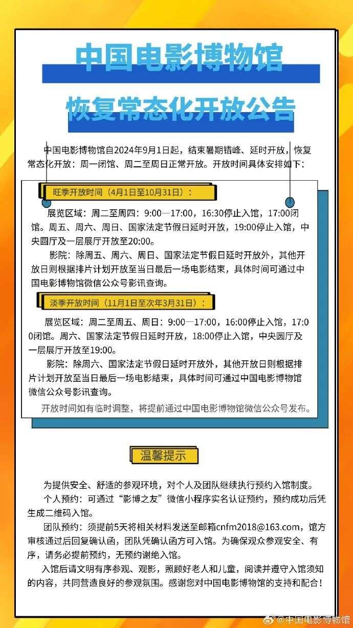 中国电影博物馆自2024年9月1日起,结束暑期错峰、延时开放,恢复常态化开放:周一闭馆、周二至周日正常开放。具体如下图——