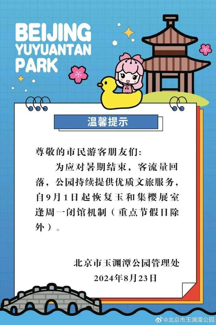 暑期结束,客流量回落,为加强展览维护,紫竹院公园自9月1日起恢复友贤山馆、问月楼等展厅逢周一闭馆机制(重点节假日除外)。