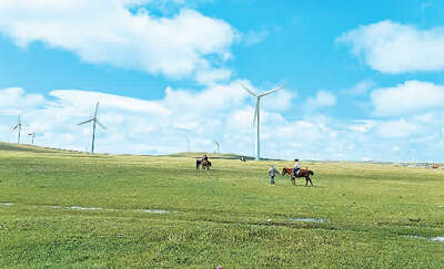 辉腾锡勒草原位于察哈尔右翼中旗,地处阴山北麓,是京津冀晋周边里程近、风光好的草原,也是保持较完好的高山草甸草原。起伏的山丘上,一排排白色风车矗立着,绿色的草原、白色的风车、湛蓝的天空,三色交织的风景吸引无数游客“边走边看”。