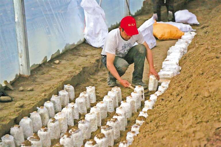 米林市米林镇红太阳家庭示范农场的工人在埋植林芝灵芝的三级菌包。本网记者 谢筱纯 摄