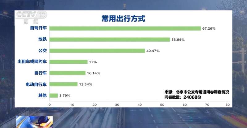 2023年,北京市相关部门向市民进行了问卷调查,在常用出行方式的选项中,只有42.47%的被访者选择公交出行,选择自驾和地铁出行的被访者则为67.26%和53.64%。对于当前公交专用道存在的问题,69.42%的被访者认为“部分专用道公交车较少”。经过调研论证和具体考量,北京市决定放开部分公交车道在休息日对社会车辆的使用权限,并于2023年6月和9月,分两批次进行了实施。