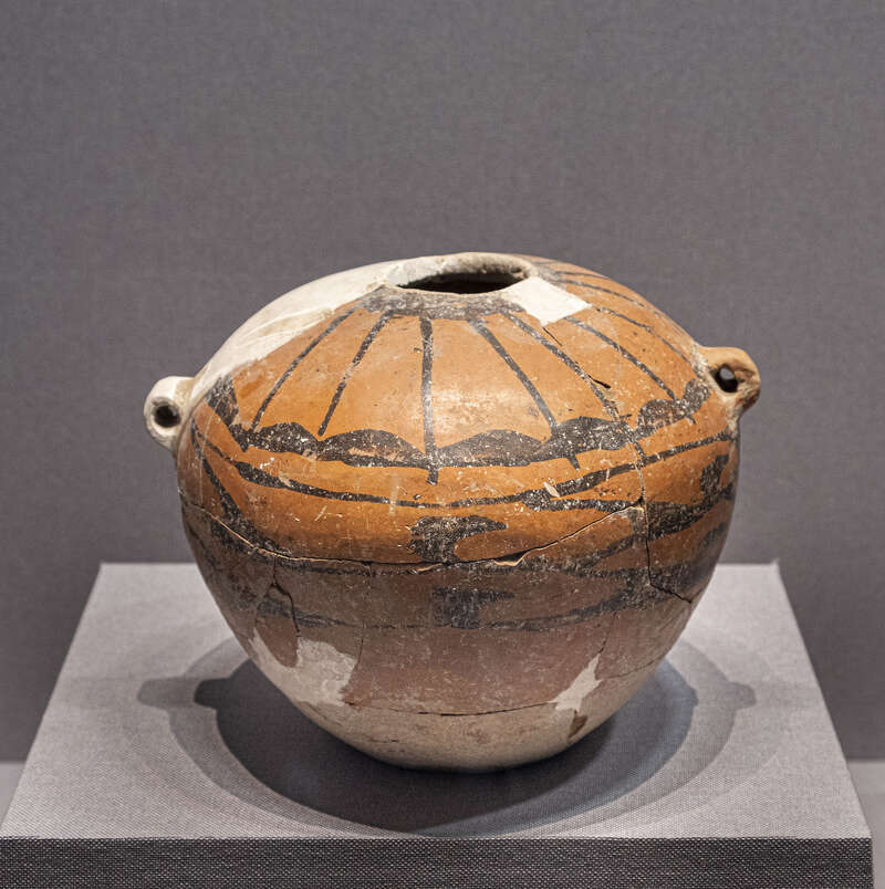 这件彩陶双耳罐,有宽大的肩膀,圆圆的嘴巴,鼓鼓的肚子,小小的耳朵,像不像一位慈祥的老者,诉说着五六千年前的往事呢?