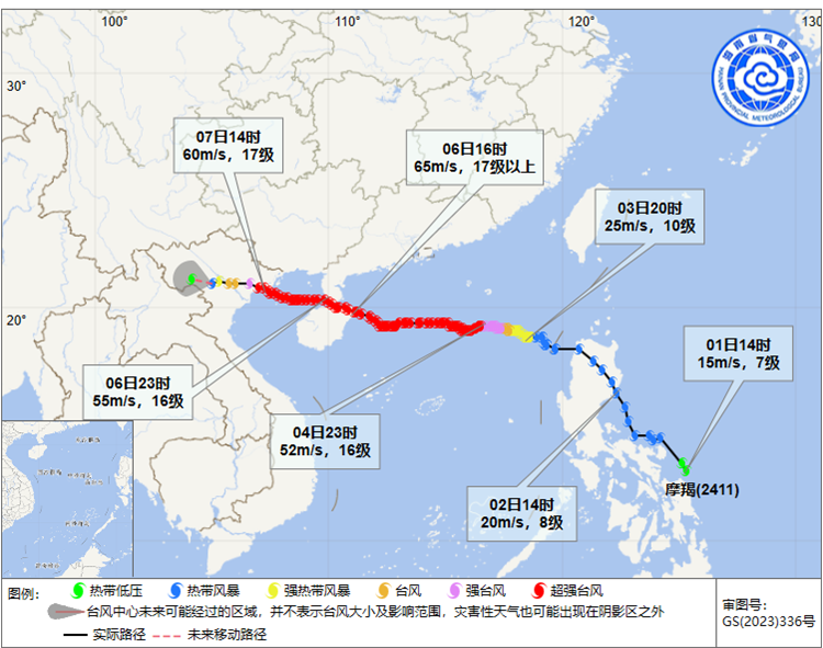 3日上午移入南海东部海面,3日20时加强为强热带风暴级。