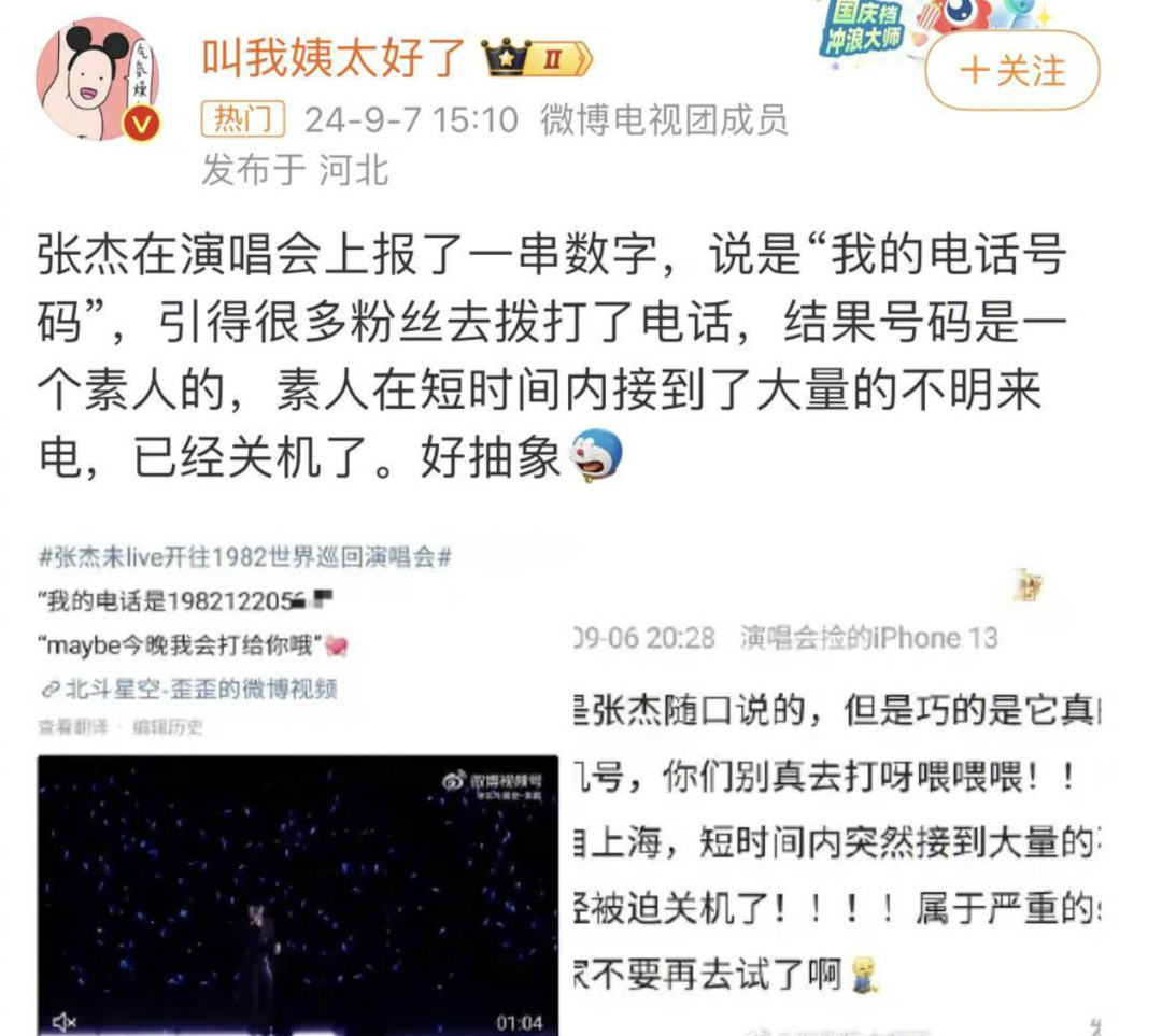 9月6日,张杰福州站演唱会上,台下有观众开玩笑称“要个电话号码”,于是张杰报了一串号码。据了解,张杰报出的手机号码前8位“19821220”正是张杰的生日。而这随口说出的号码竟真实存在。据封面新闻,目前,原手机号主被迫关机。