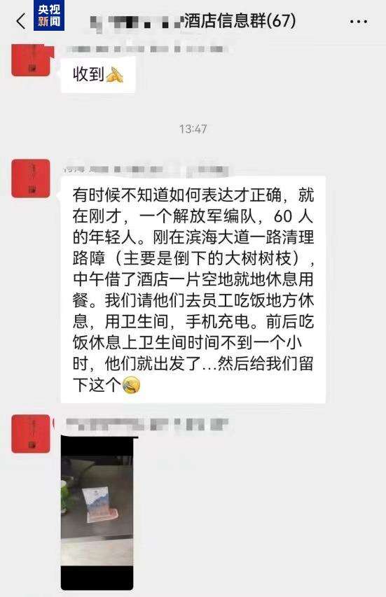 海口市一家酒店的工作人员分享,“不给人民添麻烦”的人民子弟兵在抗风救灾后,短暂借酒店空地休息,离开前还悄悄给酒店留下100元钱。