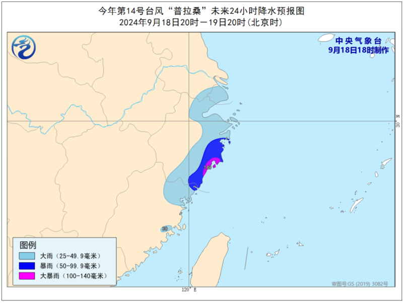 降水预报:9月18日20时至19日20时,上海、浙江东部、福建东北部等地部分地区有大到暴雨,其中,浙江东部沿海有大暴雨(100~140毫米)。