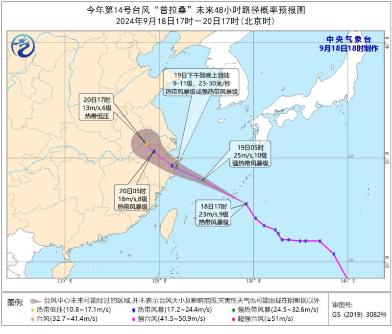 大风预报:9月18日20时至19日20时,黄海南部海面、东海大部、杭州湾、长江口区、浙江沿海、福建沿海、上海、江苏东南部、台湾海峡将有6-8级、阵风9级的大风,其中东海北部和杭州湾及长江口的部分海域、上海沿海、浙江东北部沿海、江苏东南部沿海风力可达9-10级、阵风11-12级,“普拉桑”中心经过的附近海域和地区的风力可达10-11级、阵风12-13级。