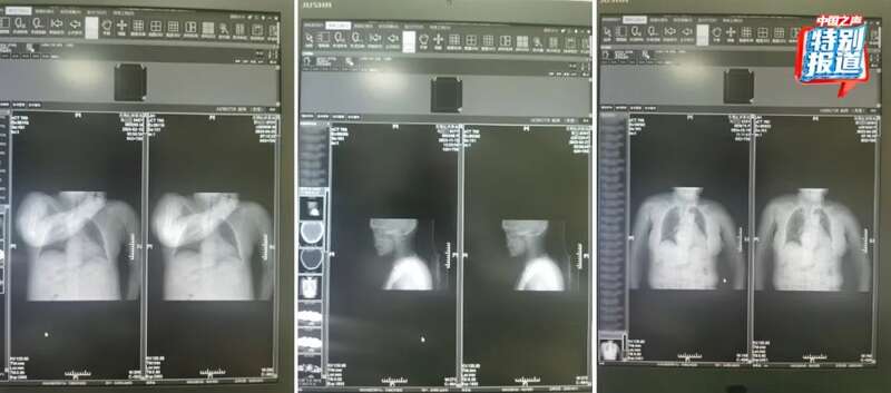 74岁的患者莫某在2023年4月27日拍摄了胸部和颈椎的CT,她的片子看起来和实际患者37岁的马某某在2023年11月拍的片子高度相似,片子里能直观看到项链都一模一样。