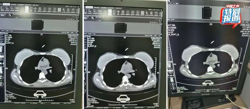 不仅这两位上了年纪的患者CT影像类似,朱成刚比对发现,2021年在他们科做过CT的25岁女性叶某的片子上,也有看起来极为相似的吊坠,肉眼看,三人的片子几乎一模一样。