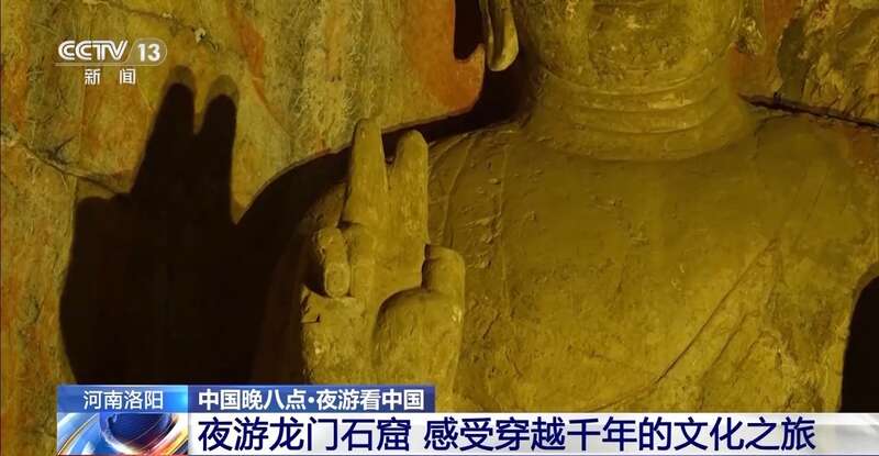 河南台记者 丁双:夜幕降临,龙门石窟大小佛洞灯光次第亮起,灯光映衬之下,龙门石窟跨越千年的庄严与华美震撼人心,如同一幅古朴而神秘的画卷徐徐展开。