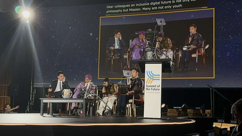 清华大学博士生谢宗旭作为汇报员,在未来峰会行动日首日闭幕式上向联合国常务副秘书长阿明娜·穆罕默德和联合国青年事务助理秘书长费利佩·保利埃作汇报,他表示,青年是数字化时代积极的参与者和共创者,呼吁推动数字教育、加强跨界合作和青年参与,以实现更加包容的可持续数字未来。