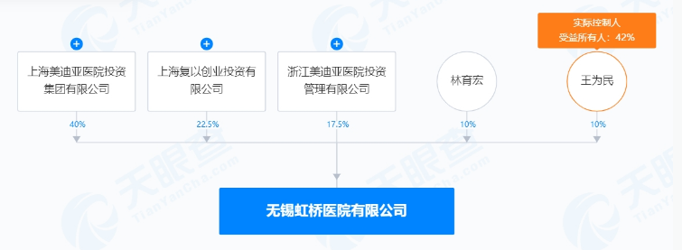 从股权结构来看,无锡虹桥医院主要有五位股东,分别为上海美迪亚医院投资集团有限公司、上海复以创业投资有限公司、浙江美迪亚医院投资管理有限公司、王为民、林育宏,分别持有40%、22.5%、17.5%、10%、10%,而王为民通过持有上海美迪亚80%股权,共对无锡虹桥医院持股42%。