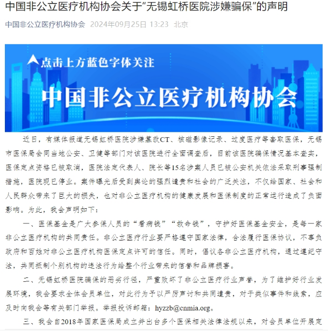 9月25日,中国非公立医疗机构协会发布关于“无锡虹桥医院涉嫌骗保”的声明称,无锡虹桥医院骗保的恶劣行径,严重败坏了非公立医疗行业声誉,为了维护好行业发展环境,协会要求全体会员单位,对此行为予以严厉声讨和共同谴责,对于类似事件和线索,应及时向协会等有关部门举报。