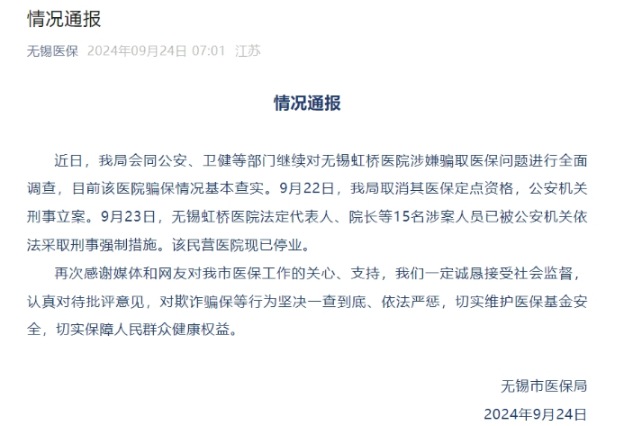 9月24日,无锡市医保局通报称,无锡虹桥医院骗保情况基本查实,医院法定代表人、院长等15名涉案人员已被公安机关依法采取刑事强制措施,目前该医院已停业。
