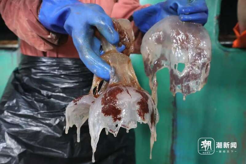 “抓海蜇的第一个小时还有点新鲜感,第二小时就不行了,腿酸。滤网时不时会有海水溅出来,整个人全部湿掉,又腥又臭。等到最后值班时间结束,双腿沉得不像自己的。”有过来人这么形容和海蜇“战斗”的感受。