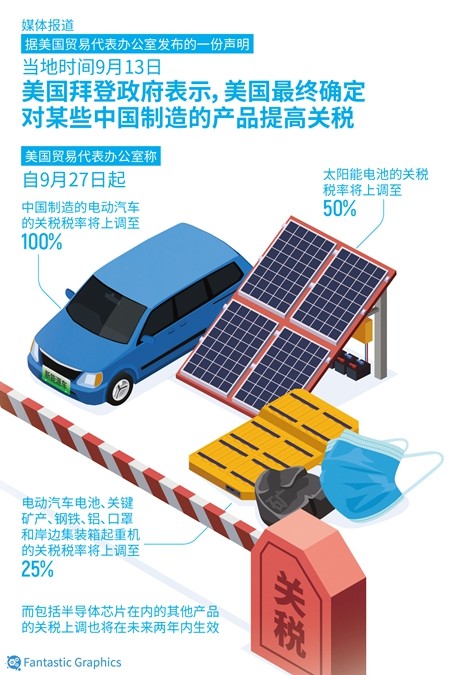 据美国贸易代表办公室发布的公告,自9月27日起,中国制造的电动汽车的关税税率从25%上调至100%,太阳能电池的关税税率从25%上调至50%,电动汽车电池、关键矿产、钢铁、铝、口罩和岸边集装箱起重机的关税税率则从0%到7.5%不等上调至25%。另包括半导体芯片在内的其他产品的关税上调也将在未来两年内生效。