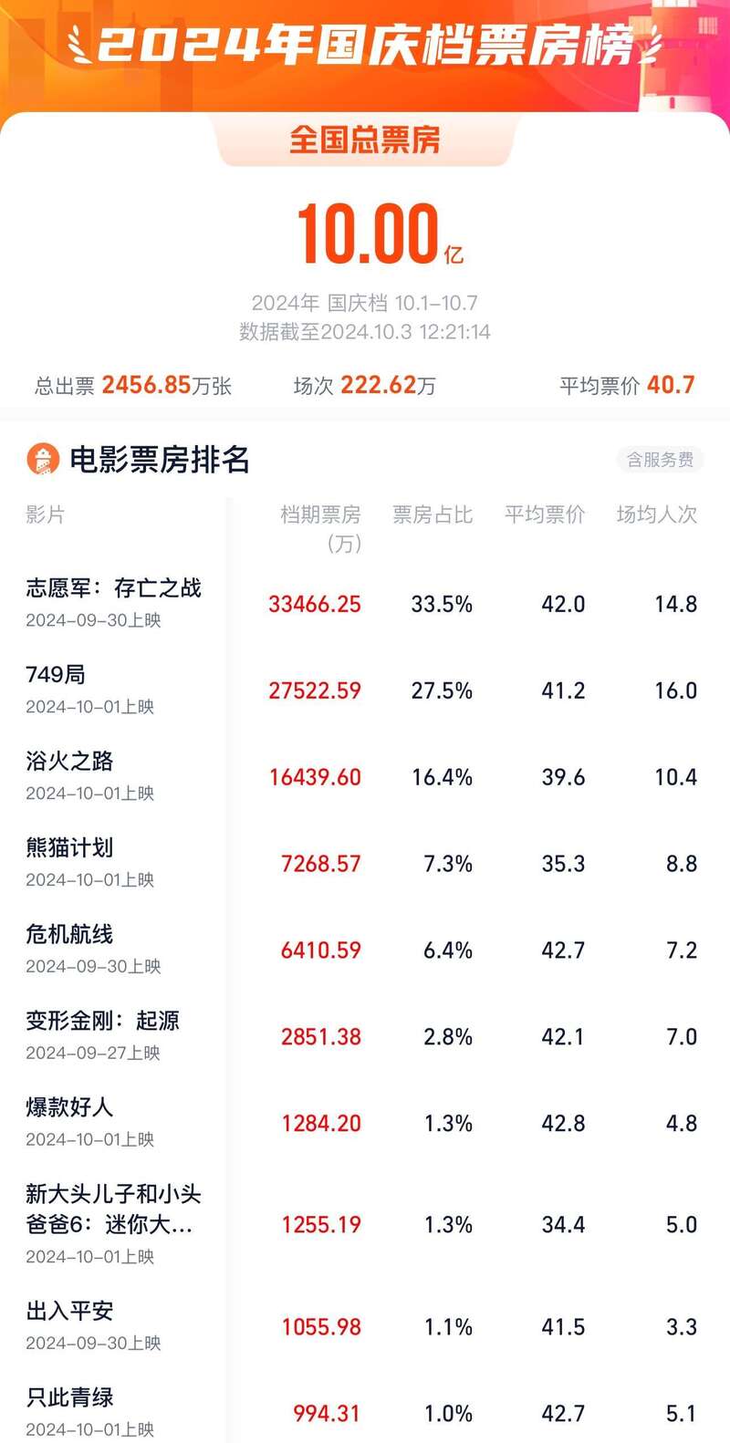 据网络平台数据,截至10月3日12时20分,2024年国庆档(10月1日—10月7日)档期内总票房(含预售)突破10亿,档期票房破10亿速度快于去年国庆档。