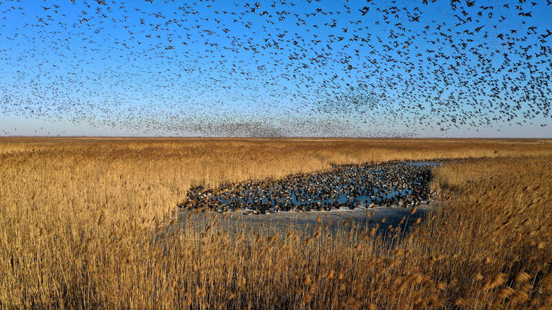张希涛:首先来的一般是鹤类和雁鸭类。丹顶鹤、蓑羽鹤、白头鹤、白枕鹤、沙丘鹤等这一系列鹤都要来。再一个雁鸭类的,像野鸭在我们这里就接近30种:斑嘴鸭、绿头鸭、秋沙鸭、白头鸭、赤麻鸭等一系列鸭。鸟浪最厉害的时候能达到一两公里,非常壮观。