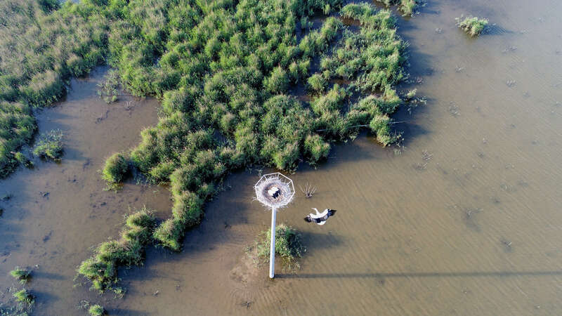周立城:东方白鹳的生活习性是在高大的乔木上安家落户,为了给它保障安全,我们建了大约130多根人工招引巢,用水泥杆或者金属杆建了一个10米左右的简易的巢穴,我们俗称“毛坯房”。还是让东方白鹳靠自己的力量用这些树枝、树叶、柳絮、棉花,做一个精装。我们对它是爱,不是溺爱。