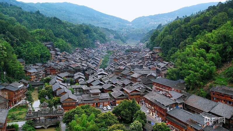 高低错落的民居与鼓楼融于青山绿水间(央广网发 黎平县融媒体中心供图)