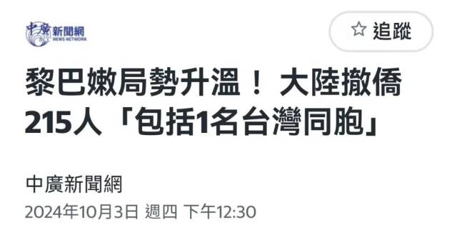消息引发岛内舆论广泛关注,多家台湾媒体对此进行了报道。“简直就是电影般、教科书般的撤侨行动”,有台媒盛赞中国大陆黎巴嫩撤侨行动。“祖国是最好的依靠”“大陆撤侨行动从未忘记台湾民众”,还有台湾专家在一档台媒节目中讨论时这样感慨。