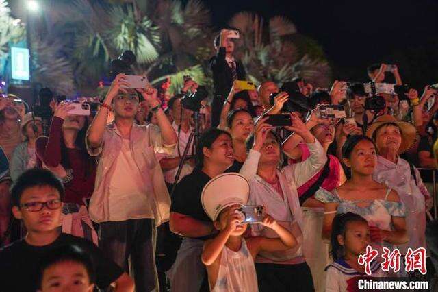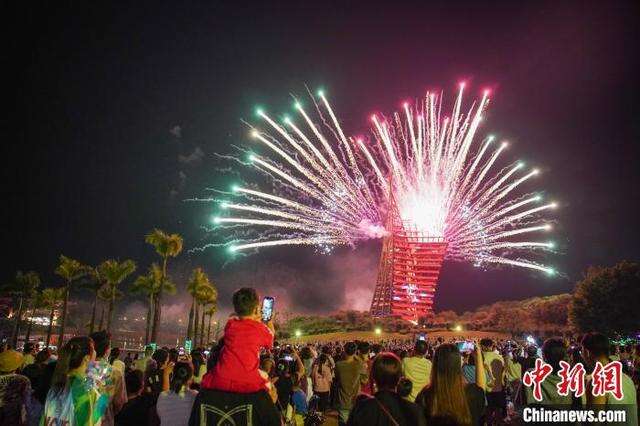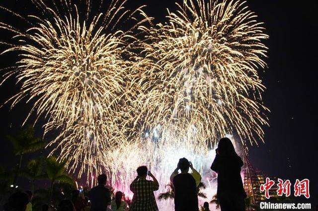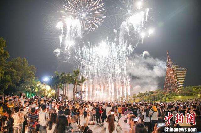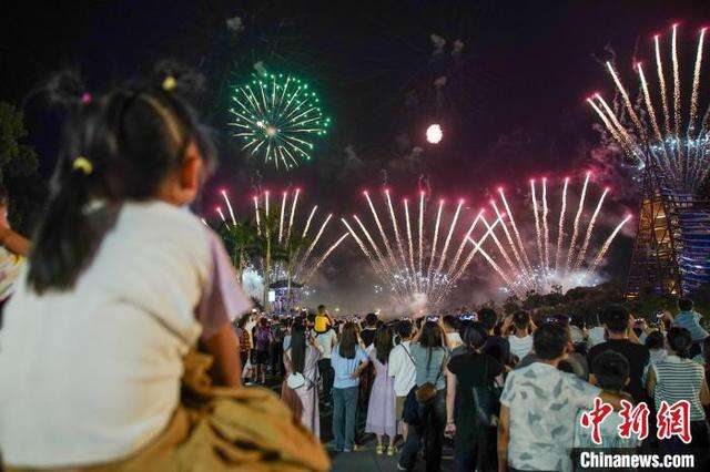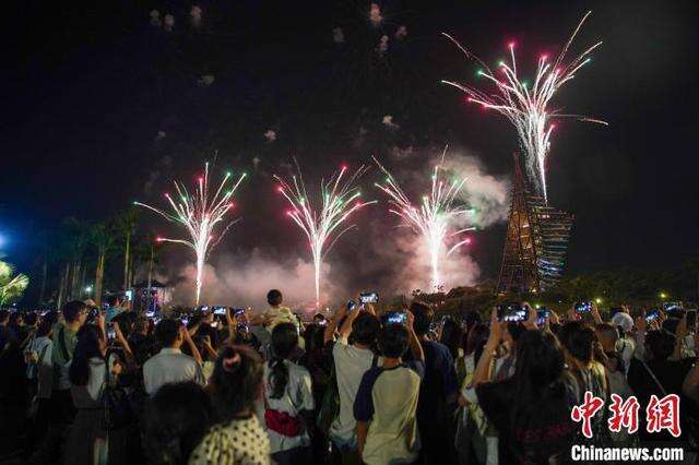 10月6日晚,广西南宁园博园上演绚丽的烟花表演,大批民众趁假期末尾带着亲朋好友前来观赏,共度浪漫之夜。中新社记者 陈冠言 摄
