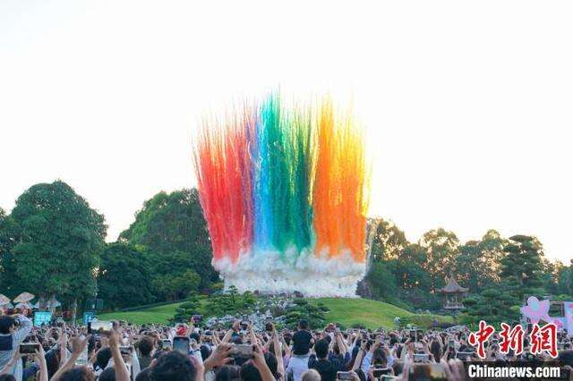 10月6日,广西南宁园博园上演色彩缤纷的日景彩烟秀,吸引大批民众前来观赏。中新社记者 陈冠言 摄