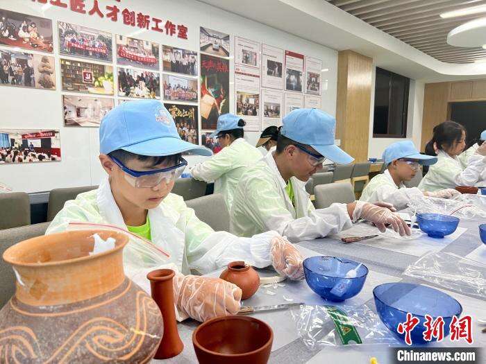 戴上护目镜和手套、拼接陶碗碎片、填补石膏并打磨平整……在专业老师的指导下,11岁的张郑俊男化身“文物修复师”。尽管这是“第一次尝试、有点难”,但直观地看着“文物”逐渐恢复原状,他感到意犹未尽。