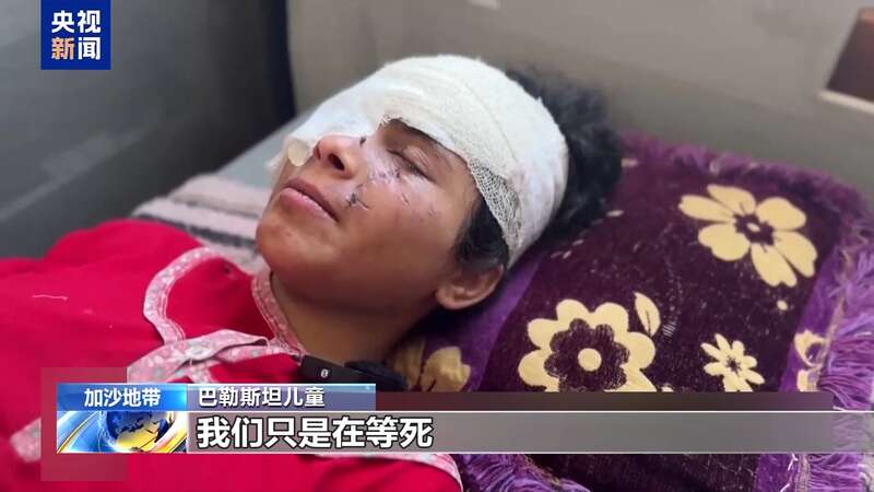 在加沙地带的一所医院里,一个巴勒斯坦女孩正在病床上痛苦地哭泣。