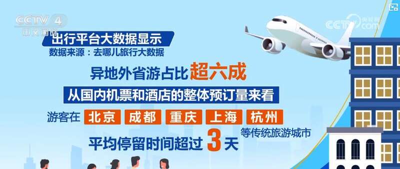 这个国庆假期,不少人选择5—7天的中长途游。出行平台大数据显示,异地外省游占比超六成。从国内机票和酒店的整体预订量来看,游客在北京、成都、重庆、上海、杭州等传统旅游城市平均停留时间超过3天。