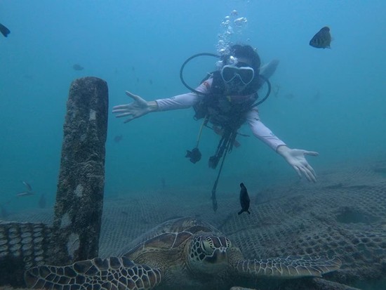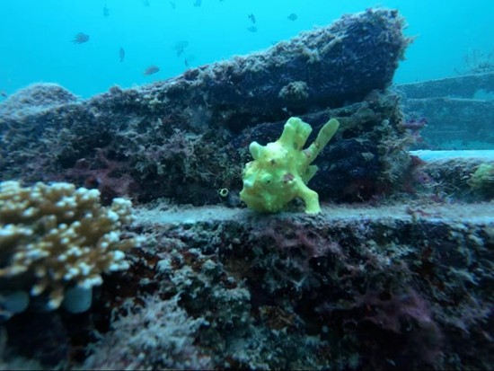 教练带着我探索海底世界:海底有废弃的小舢板、小木屋、小船,一只黄色的青蛙鱼鼓着腮帮子,躲在沉船栏杆上;海龟伏在沉船的网上,像是在休息;小丑鱼藏在红色海葵里,任由海葵的触角一张一合。