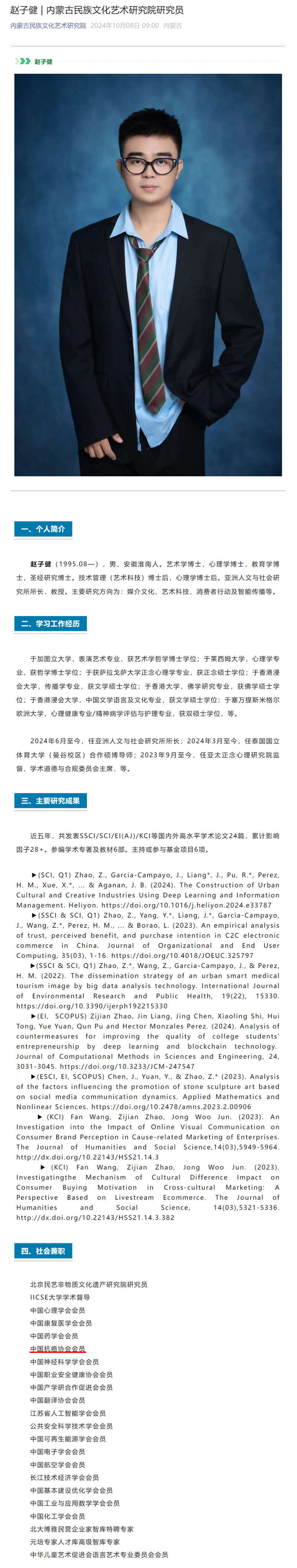 10月8日,内蒙古民族文化艺术研究院官方微信公众号发布的赵子健简历信息称,“赵子健(1995.08—),男,安徽淮南人。艺术学博士,心理学博士,教育学博士,圣经研究博士。技术管理(艺术科技)博士后,心理学博士后。亚洲人文与社会研究所所长,教授。主要研究方向为:媒介文化、艺术科技、消费者行动及智能传播等。”