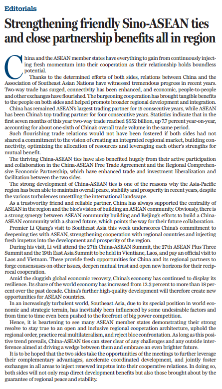 中国与东盟关系潜力无限,不断为双方合作注入新动力,对双方大有裨益。10月10日至11日,第27次中国—东盟(10+1)领导人会议、第27次东盟与中日韩(10+3)领导人会议和第19次东亚峰会在老挝万象召开。双方当以此为契机,进一步发挥互补优势,加快协调发展,促进各领域交流,为双方合作关系注入新动力。在此过程中,双方不仅将获得直接的经济利益,也将获得保障地区和平与稳定所带来的红利。