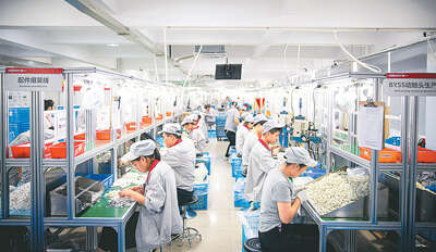 工人在浙江省乐清市奔一新能源有限公司生产线上工作。