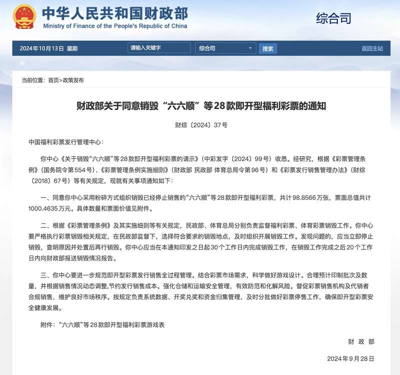 为进一步优化福利彩票游戏结构,促进彩票市场健康发展,近日(12日),财政部发布通知,同意中国福利彩票发行管理中心,采用粉碎方式组织销毁已经停止销售的“六六顺”等28款即开型福利彩票,共计98.8566万张,票面总值共计约1000万元。据了解,2023年9月,财政部已经同意中国福利彩票发行管理中心停止销售“六六顺”等41款即开型福利彩票游戏。