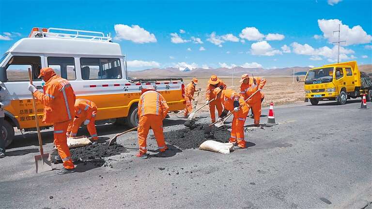 “我们养护的这段公路,每年只有两个季节,冬季和夏季。冬季漫长,主要的工作是铲雪保通;夏季短暂,主要就是不断填坑铺油。”地嘎告诉记者,青藏公路长期承担着进出藏物资运输重任,每天进出藏车流量大。养护保通工作虽然单调,但大家都明白这份工作的重要性。