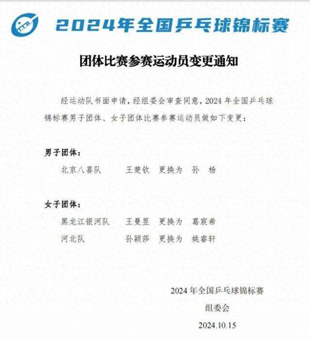 10月15日,2024全国乒乓球锦标赛组委会发布《团体比赛参赛运动员变更通知》: