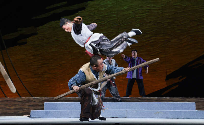 舞台上,兰州的筏客子们挥桨搏浪,带领观众拨开历史的尘雾,穿越到了20世纪30年代的黄河岸边……中山铁桥、兰州水车、羊皮筏子、兰州太平鼓,一个个具有浓郁地域特色的文化元素,让浓浓的黄河文化气息扑面而来。