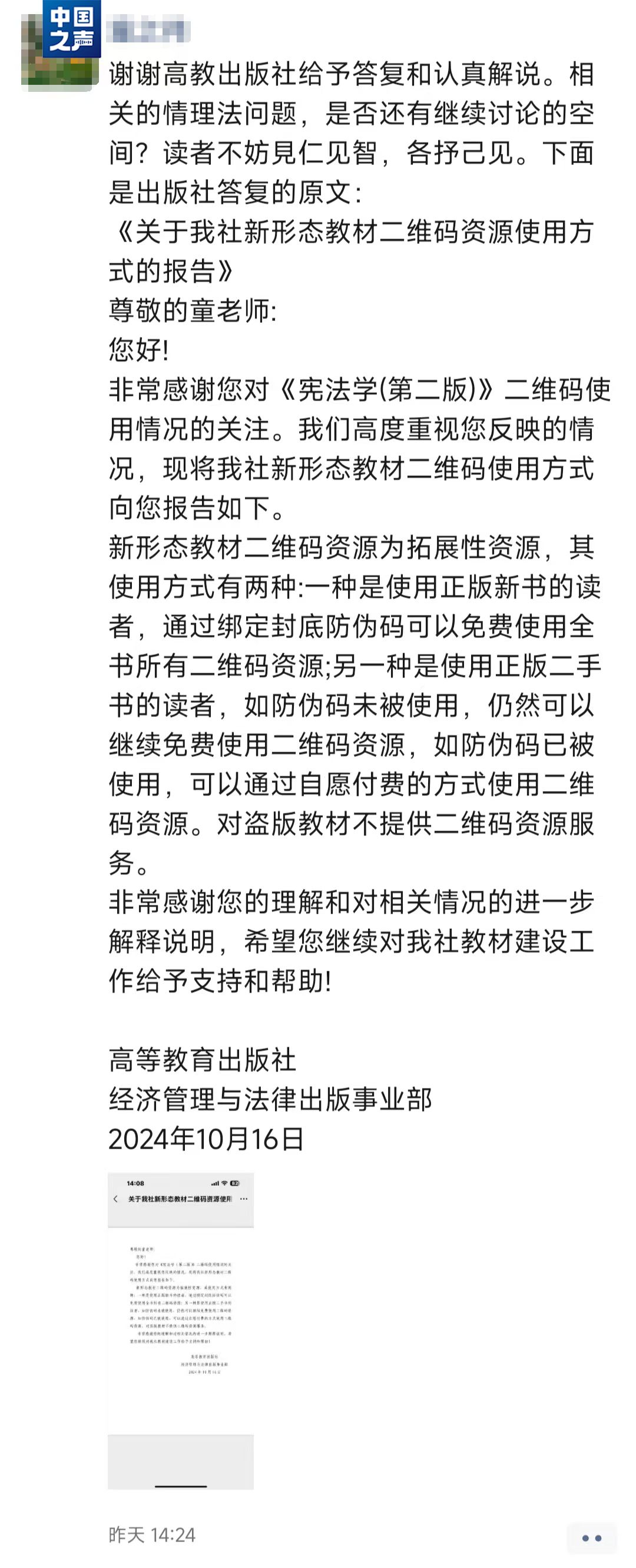 近期,华东政法大学一位教授指出,高等教育出版社《宪法学》教材中设置了46个付费二维码,每个3元,一共要扫码付138元,才能解锁教材完整内容。