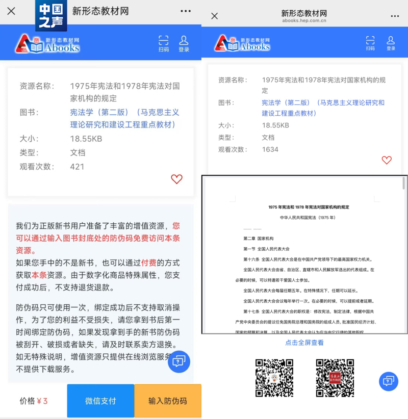 据媒体报道,扫描高等教育出版社《宪法学》(第二版)书中的二维码后,出现相应名称资源的同时,下方还有“输入防伪码”和“微信支付”两个选项,并标注了价格为3元。