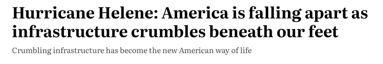 《华盛顿时报》近日发表文章,题为《飓风“海伦妮”:随着基础设施在我们脚下崩溃,美国正在分崩离析》。文章指出,摇摇欲坠的基础设施已成为美国的新生活方式。尽管美国政府已经承诺投入纳税人的数亿资金来解决基础设施问题,但在应对洪水、飓风、山火和干旱等气候灾害时仍严重缺乏准备,这是美国各政党政治家们的集体失职。