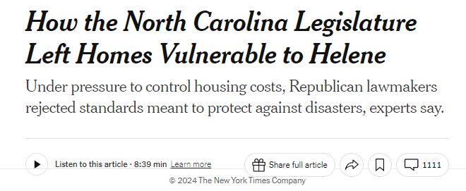 《纽约时报》10月3日报道称,在控制建房成本的压力下,过去15年间,美国北卡罗来纳州的立法者拒绝了多项能够减轻灾难性风暴危害的措施,导致风暴造成更多房屋受损并增加了危害风险。