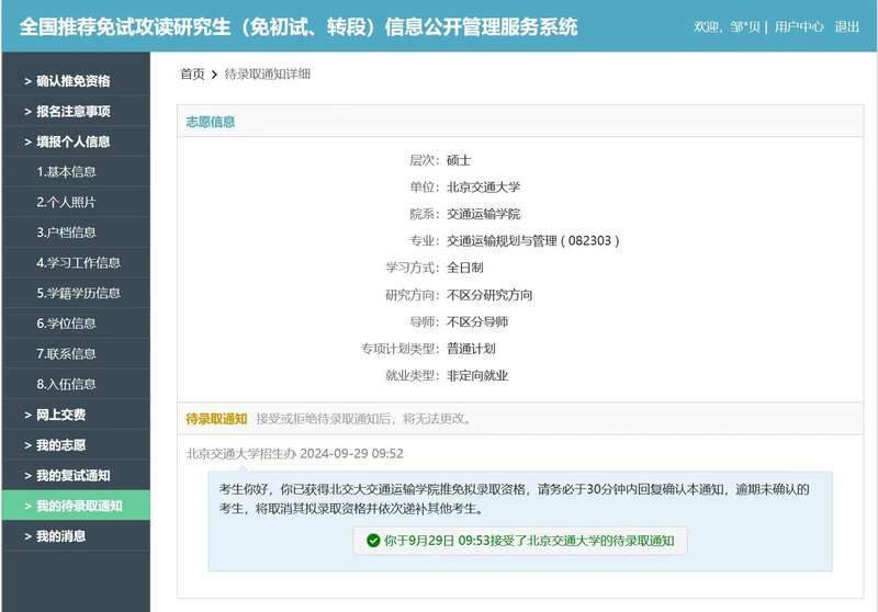 如今,她成功保研至北京交通大学,选择交通运输规划与管理专业继续深造。