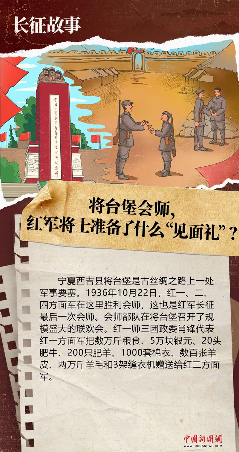 宁夏西吉县将台堡是古丝绸之路上一处军事要塞。1936年10月22日,红一、二、四方面军在这里胜利会师,这也是红军长征最后一次会师。会师部队在将台堡召开了规模盛大的联欢会。红一师三团政委肖锋代表红一方面军把数万斤粮食、5万块银元、20头肥牛、200只肥羊、1000套棉衣、数百张羊皮、两万斤羊毛和3架缝衣机赠送给红二方面军。