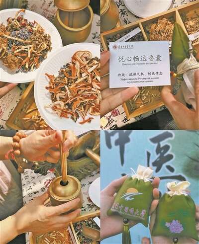 小李在夜市上自己制作了一个中药香囊,很是喜欢。她亲手体验将薰衣草、玫瑰花、橘皮、柴胡、合欢等捣药装袋,又自选了一个绣着悦心畅达的中药香囊套上。摊主说,平时把香囊带在身上,可以起到舒缓压力的作用。