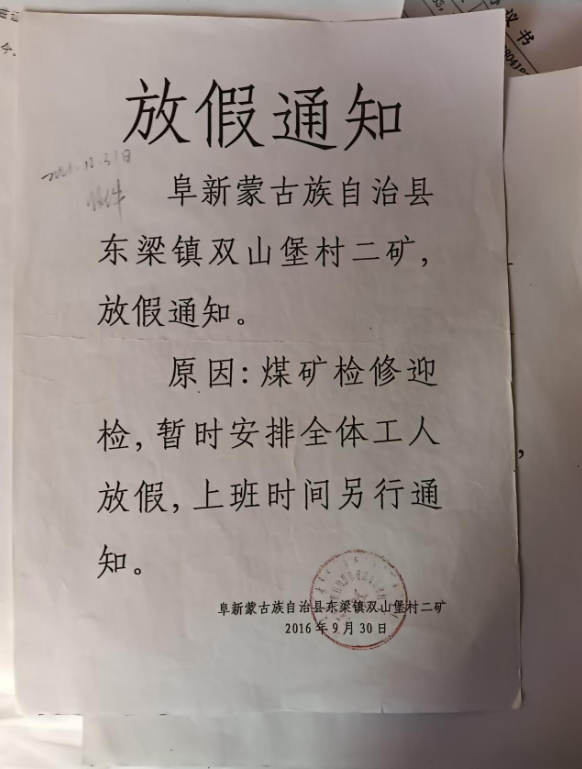 2016年9月下旬,阜新县境内的煤矿几乎都下发了一份内容基本一致的通知,称“因煤矿检修迎检,暂时安排全体工人放假,上班时间另行通知”。“放假”之后,李细仲简单收拾了一点随身物品就回湖南老家了。李细仲说,“当时,矿上讲只放一阵子假”,都以为过段时间就回去上班了。